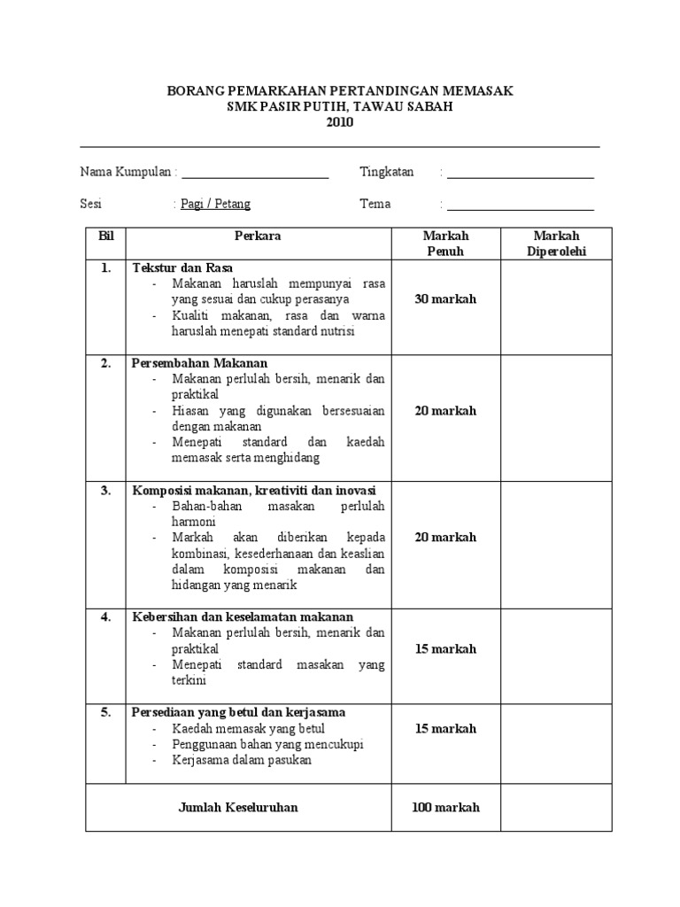 Contoh Borang Pemarkahan Pertandingan Memasak : Idea yang relevan mengikut tugasan, dihuraikan dengan jelas dan matang, disertakan dengan contoh yang sesuai.. Bagaimana aturan mainnya dan contoh surat peringatan? 38164535 borang pemarkahan an memasak. Pemberian sp diatur dalam uu ketenagakerjaan. Cara memasak mie instant pop mie dalam cup by edwin fauzi sn:112864020. Contoh borang yang diguna pakai di sekolah bagi murid yang ingin menyertai pertandingan nyanyian.