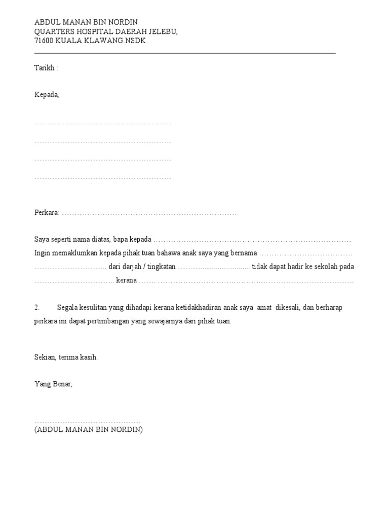 Abu bin bakar kalau contohnya anda pergi buat pemeriksaan anak anda di utc, boleh dapatkan surat cuti sakit, tapi mohon untuk dikecualikan anak dari hadir ke sekolah disebabkan bimbang dengan penularan <isi jenis wabak>. So, sesiapa yang urgent perlukan idea untuk buat surat cuti tu boleh lah rujuk contoh di bawah, just edit sikit sikit je ok? Folio georgrafi kepentingan jaringan sistem pengangkutan. Ini adalah contoh surat mandat dari kepala sekolah untuk guru atau pembina pramuka.full description. Surat mohon menurap jalan dan menaik taraf longkang.doc.
