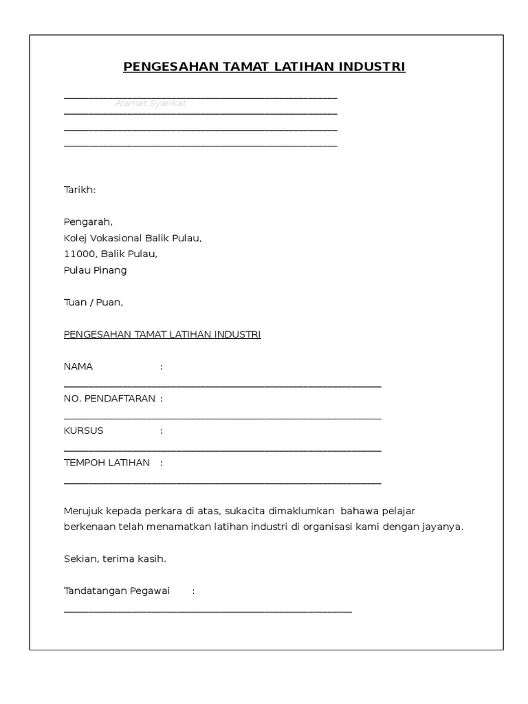 Pengurus abc sdn bhd, 06000 alor setar, kedah darul aman. Salinan surat pengesahan tamat belajar untuk pelajar dalam negara (sabah dan sarawak) tiket asal penerbangan. Tanda pengesahan fotokopi surat keterangan pengganti yang berpenghargaan sama dengan ijazah/sttb format 4a : Surat pengesahan tamat pengajian (sekiranya tidak dicatatkan tarikh tamat pengajian pada ijazah/transkrip). Documents similar to surat pengesahan tamat latihan industri.